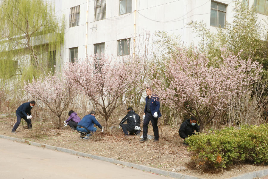 目之所及,厂区绿化带的植被尚未全面复苏,两百多棵月季还在沉睡。同志们纷纷戴上手套,拿起剪刀、镰刀、锯子、耙子、夹子等工具,修剪月季带刺的枯枝,打扫法桐布满尘土的枝干,以及扫除落叶、清除杂草及垃圾杂物,将绿化园圃打理得整整洁洁。挥洒汗水的忙碌身影,与绚丽盛开的朵朵杏花一并形成了亮丽的风景线。